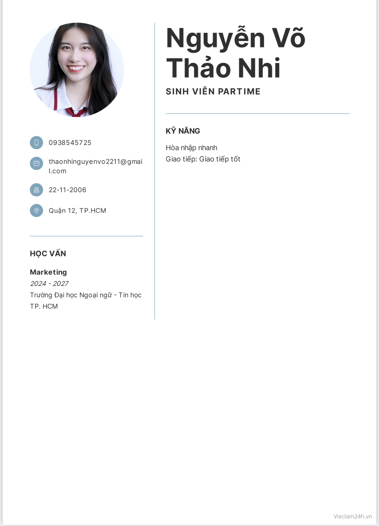 Nguyễn Võ Thảo Nhi 22/11/2006 Shortlist Invite About Candidate Education Đ Đại học 2024-2027 Trường Đại học Ngoại ngữ - Tin học Thành phố Hồ Chí Minh (HUFLIT) Portfolio Skills Tự tin 80% Giao tiếp 90% Hoà nhập 80% Giải quyết vấn đề 75% Related Candidates Diệp Gia Hân Marketing cố gắng ham học hỏi kiên trì nhanh nhẹn sáng tạo Shortlist View Profile Trần Nguyên Thống Marketing Shortlist View Profile Dương Trần Yến Nhi Marketing #cầu tiến #genz ham học hỏi sáng tạo siêng năng Shortlist View Profile Lê Nguyễn Yến Nhi Marketing @noluc #hoatngon #hochoi #nangdong vuitinh Shortlist View Profile