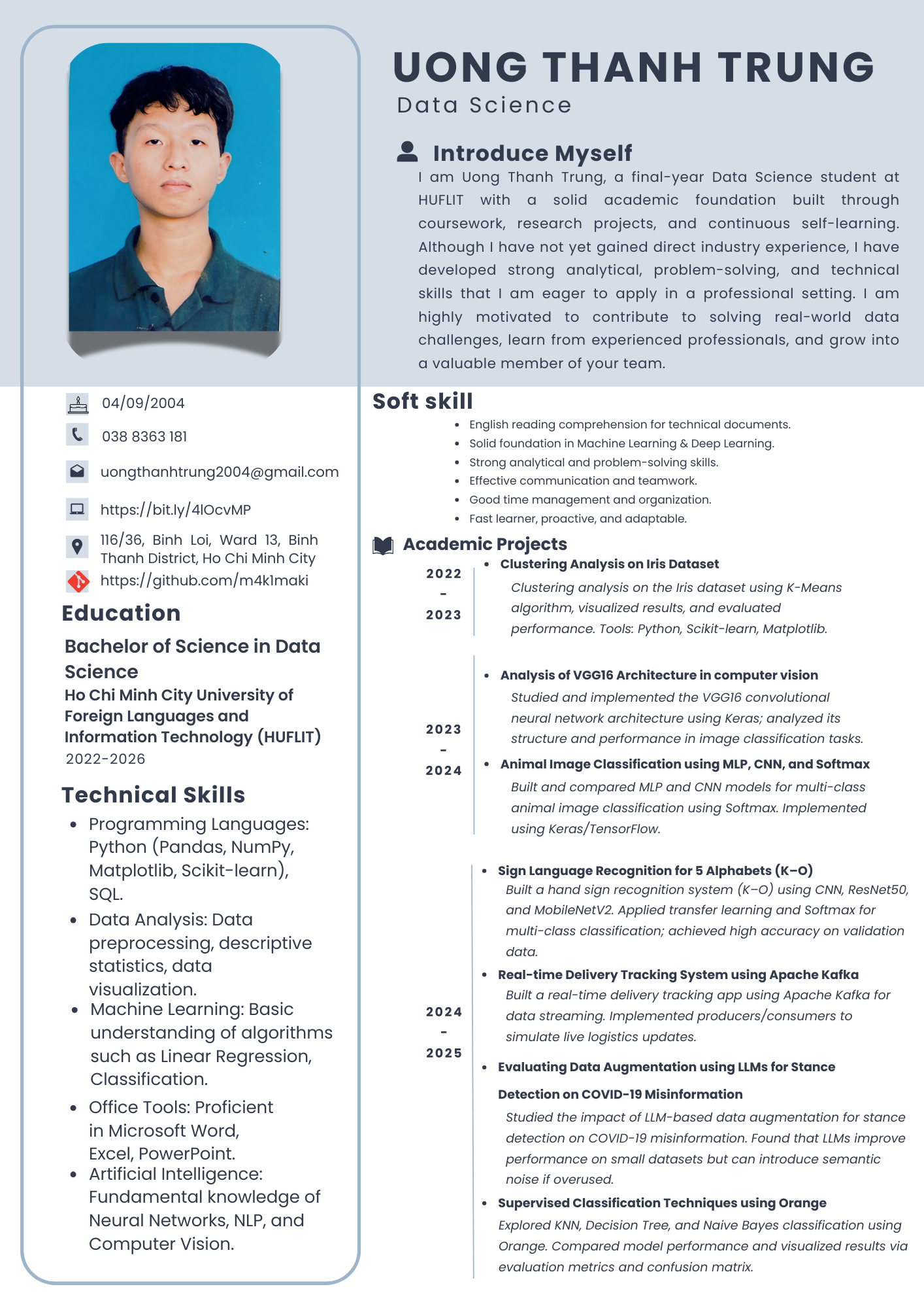 Uông Thành Trung 04/09/2004 Shortlist Invite Download CV About Candidate Education D Data Science 2022-2026 HUFLIT bachelor Portfolio Skills Troubleshooting Programming Awards N None Related Candidates Phạm Tấn Vương Khoa học dữ liệu Shortlist View Profile Bùi Tuấn Đạt Khoa học dữ liệu Shortlist View Profile Nguyễn Anh Huy Khoa học dữ liệu Shortlist View Profile Văng Công Thái Toàn Khoa học dữ liệu #alwayslearning #curiousmind #positivevibes #teamspirit friendly Shortlist View Profile